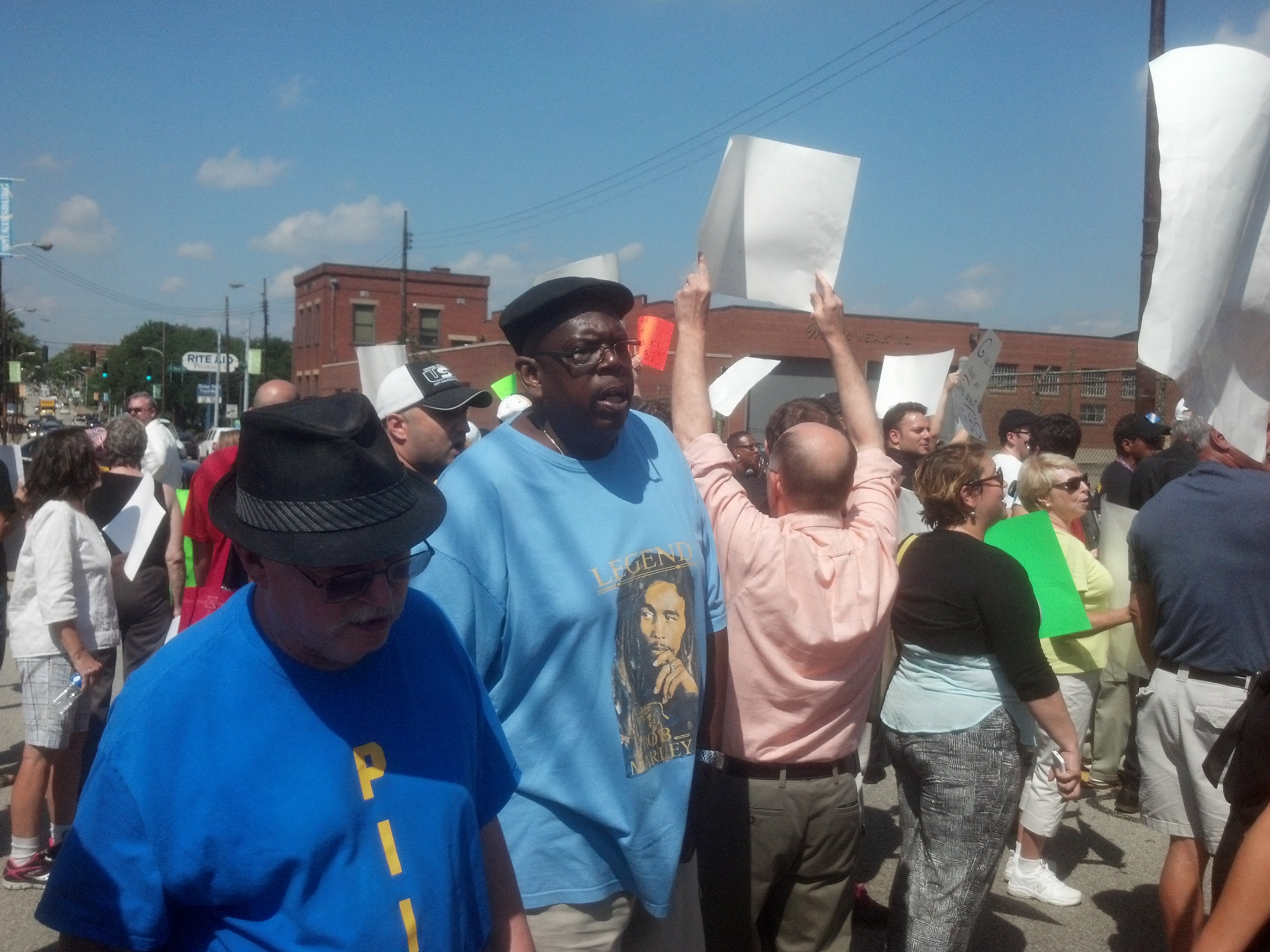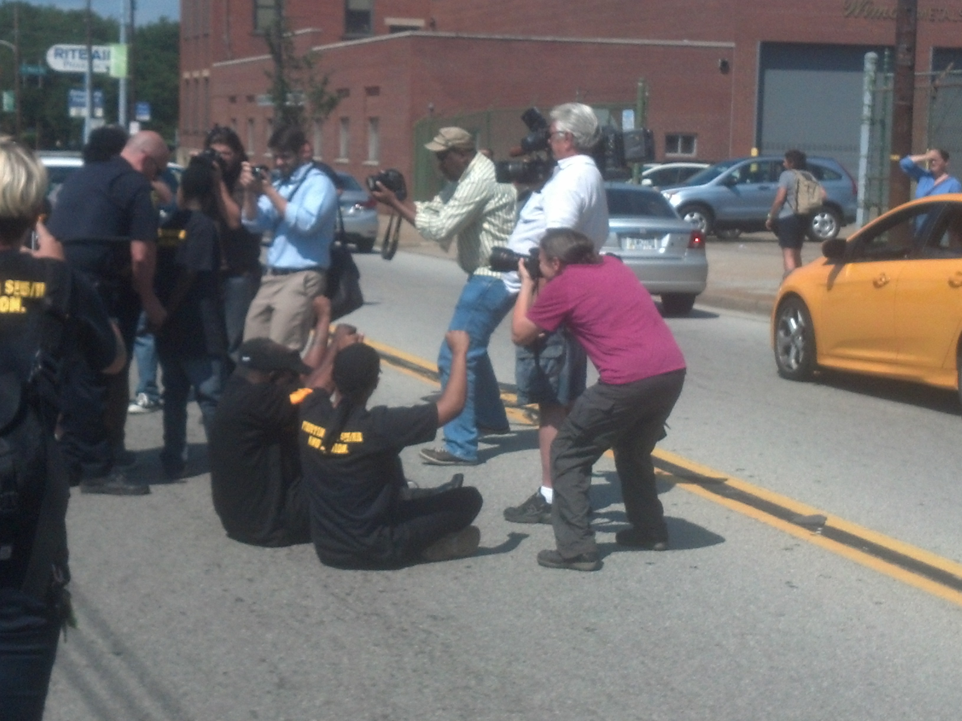 East End NOW joined over 100 fast food workers and their supporters for the National protest in Wilkinsburg today marching and picketing McDonalds for fair and livable wage of $15 per hour. About 8 African American workers, young and old, were arrested for the their civil disobedience of disrupting traffic and refusing to disburse as the majority of protesters moved to the sidewalk. The police did their duty and duly arrested the 8 protestors without incident.