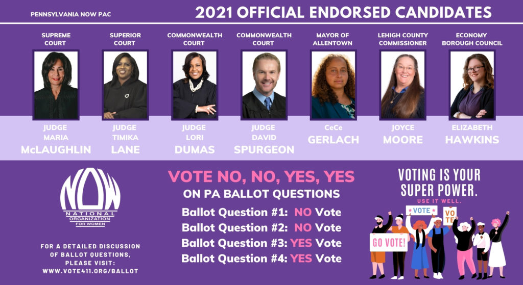 | The Pennsylvania NOW PAC was happy to support each of the candidates below on our 2021 Primary Feminist Ballot and we are proud of their commitments to advocating on behalf of our mission and supporting the communities we serve. Six of our seven endorsed candidates will go on to the general election in November 2021. We’d like to take a moment to congratulate all of our endorsed candidates and thank you for being a part of the political process and moving PA forward. |